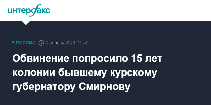 Москва. 2 апреля. INTERFAX.RU - Прокуратура попросила Ленинский райсуд Курска назначить бывшему губернатору региона Алексею Смирнову 15 лет колонии строгого режима по делу о получении взяток при возведении фортификационных сооружений, сообщает объединенная пресс-служба судов Курской области.