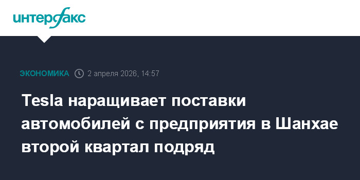 Москва. 2 апреля. INTERFAX.RU - Tesla Inc. увеличивает поставки с шанхайского завода второй квартал подряд, несмотря на усиливающуюся конкуренцию в сфере электромобилей.