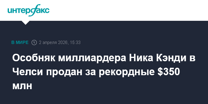 Москва. 2 апреля. INTERFAX.RU - Британский миллиардер Ник Кэнди продал свой особняк в лондонском районе Челси более чем за 270 млн фунтов стерлингов ($350 млн), сообщает Bloomberg и отмечает, что эта цена считается рекордной в истории для частного дома.
