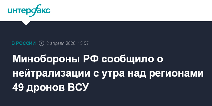 Москва. 2 апреля. INTERFAX.RU - Дежурными средствами ПВО с 7:00 до 14:00 по московскому времени перехвачены и уничтожены 49 украинских беспилотников, в том числе над Московским регионом, сообщило Минобороны РФ в четверг.