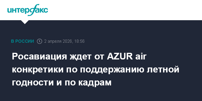 Москва. 2 апреля. INTERFAX.RU - Росавиация рассчитывает получить от AZUR air доработанный план действий для снятия ограничений сертификата эксплуатанта на следующей неделе и ждет конкретики в части поддержания летной годности парка и "по кадрам", заявил журналистам глава Росавиации Дмитрий Ядров.