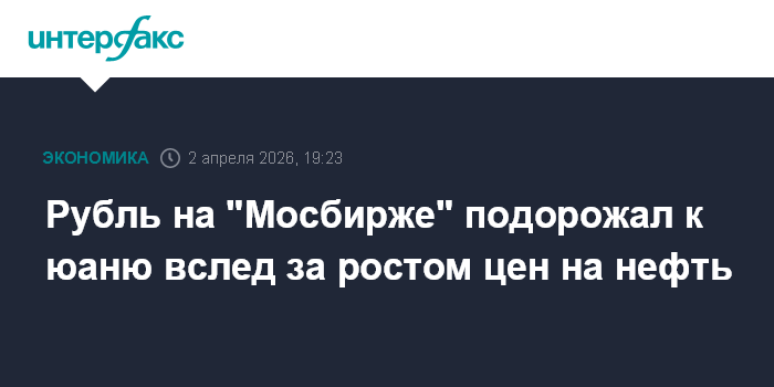 Москва. 2 апреля. INTERFAX.RU - На торгах четверга на "Московской бирже" рубль подорожал к юаню вслед за ростом котировок нефти.