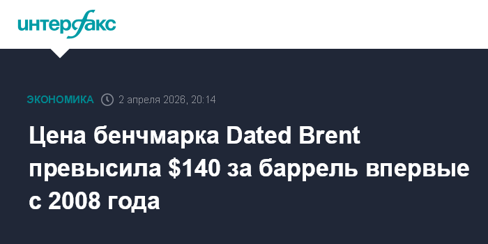 Еще 1 апреля Dated Brent стоила чуть более $128 за баррель, однако 2 апреля бенчмарк подорожал до $141,37 за баррель, что выше максимумов, зафиксированных в начале российско-украинского конфликта в 2022 году.