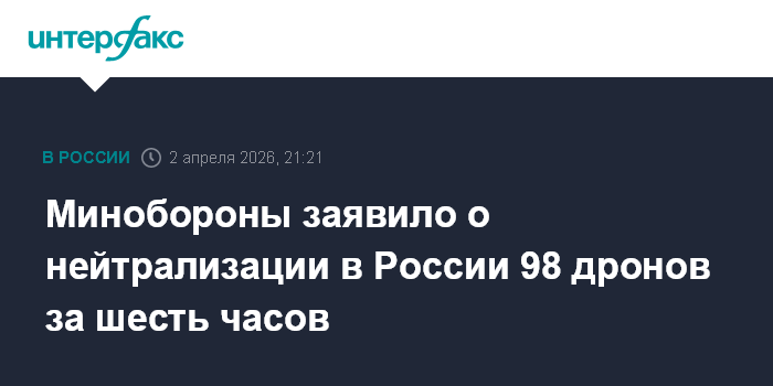 Москва. 2 апреля. INTERFAX.RU - Российские средства ПВО с 14:00 до 20:00 по Москве нейтрализовали 98 беспилотников, в том числе над московским регионом, заявило Минобороны.