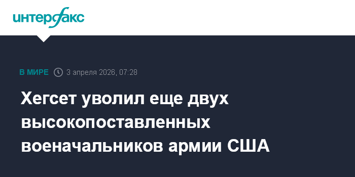 Москва. 3 апреля. INTERFAX.RU - Министр войны США Пит Хегсет уволил еще двух высокопоставленных военачальников вслед за начальником штаба американской армии, сообщила газета The Washington Post со ссылкой на информированные источники.