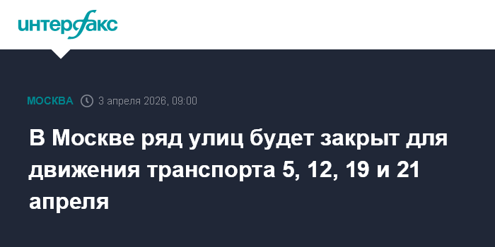 В Москве ряд улиц будет закрыт для движения транспорта 5, 12, 19 и 21 апреля