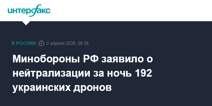 Москва. 3 апреля. INTERFAX.RU - Средства противовоздушной обороны с 23:00 до 8:00 по московскому времени перехватили и уничтожили над российскими регионами 192 украинских беспилотника самолетного типа, сообщили в министерстве обороны РФ в пятницу.