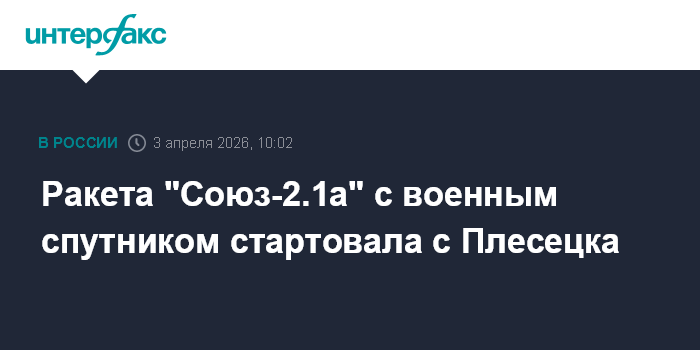 "В пятницу, 3 апреля, в 9 часов 28 минут (мск) с Государственного испытательного космодрома министерства обороны Российской Федерации (космодром "Плесецк") в Архангельской области боевым расчетом космических войск Воздушно-космических сил успешно осуществлен пуск ракеты-носителя среднего класса "Союз-2.1а" с космическим аппаратом в интересах Минобороны России", - говорится в сообщении ведомства.
