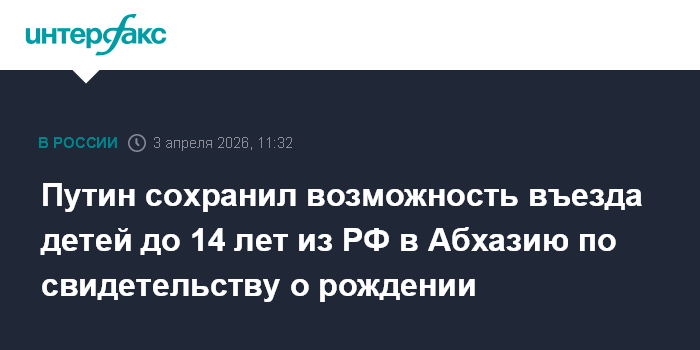 Москва. 3 апреля. INTERFAX.RU - На 2026 и 2027 годы сохраняется возможность въезда детей до 14 лет из России в Абхазию по свидетельству о рождении, сообщил первый заместитель руководителя администрации президента РФ Сергей Кириенко во время выступления на абхазском международном экономическом форуме "Абхазия - инвестиции в будущее".