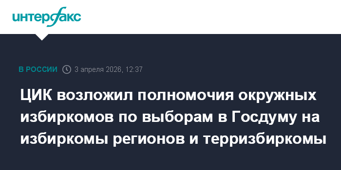 Москва. 3 апреля. INTERFAX.RU - Центризбирком России принял постановление о возложении полномочий окружных избирательных комиссий на предстоящих выборах депутатов Госдумы девятого созыва на избиркомы регионов и территориальные избиркомы.