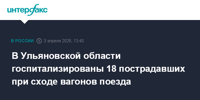 Москва. 3 апреля. INTERFAX.RU - Госпитализированы 18 пострадавших в результате схода нескольких вагонов пассажирского поезда в Ульяновской области; состояние двух из них оценивается как тяжелое, сообщил помощник министра здравоохранения РФ Алексей Кузнецов.