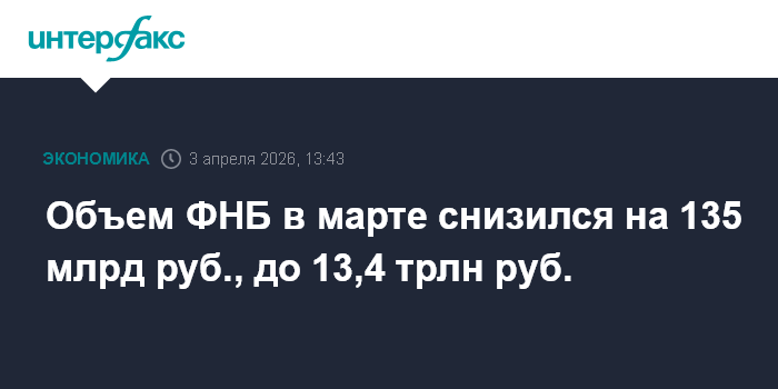 Москва. 3 апреля. INTERFAX.RU - Объем Фонда национального благосостояния (ФНБ) в марте 2026 года продолжил снижаться и сократился на 134,96 млрд рублей после уменьшения в феврале на 90,5 млрд рублей, свидетельствуют данные, опубликованные на сайте Минфина РФ. В январе 2026 года и декабре 2025 года он рос на 224,1 млрд рублей и 156 млрд рублей соответственно.