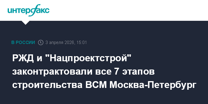 Москва. 3 апреля. INTERFAX.RU - ОАО "РЖД" и ГК "Нацпроектстрой" (НПС) завершили формирование контрактной базы по всем семи этапам строительства высокоскоростной железнодорожной магистрали (ВСМ) из Москвы до Санкт-Петербурга, сообщил НПС.
