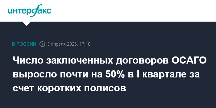 Москва. 3 апреля. INTERFAX.RU - Общее количество договоров ОСАГО, заключенных в I квартале 2026 года, превысило 15,55 млн против 10,68 млн годом ранее, весь рост приходится на короткие полисы "автогражданки", сообщает Национальная страховая информационная система (НСИС) - оператор Автоматизированной информсистемы (АИС) страхования.