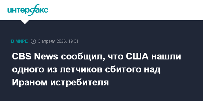 Москва. 3 апреля. INTERFAX.RU - Американским военным в ходе поисково-спасательной операции удалось отыскать одного из летчиков самолета F-15E, сбитого иранскими силами ПВО, сообщает в пятницу CBS News со ссылкой на неназванных официальных лиц.