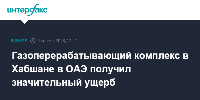 Москва. 3 апреля. INTERFAX.RU - Газоперерабатывающий комплекс в Хабшане в ОАЭ (Абу-Даби, управляет эмиратская госкомпания ADNOC) получил значительные повреждения после возникшего пожара из-за падения обломков после работы ПВО, сообщает официальный пресс-офис Абу-Даби.