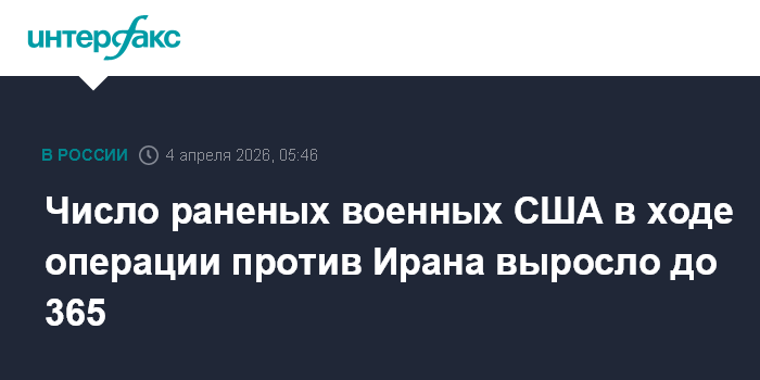 Москва. 4 апреля. INTERFAX.RU - По меньшей мере 365 американских военнослужащих получили ранения с начала боевых действий против Ирана, сообщает Пентагон.