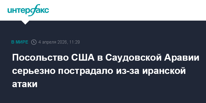 Москва. 4 апреля. INTERFAX.RU - Посольство США в столице Саудовской Аравии Эр-Рияде получило серьезные повреждения в результате ударов иранских беспилотников в пятницу, сообщила газета The Wall Street Journal, ссылаясь на дипломатические источники.