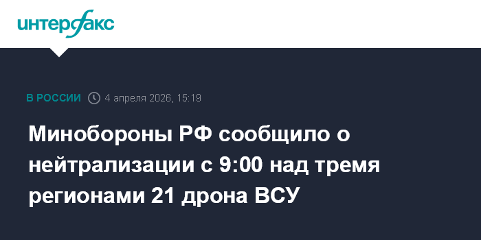 Москва. 4 апреля. INTERFAX.RU - Российскими военными в субботу с 9:00 до 15:00 по московскому времени сбит 21 беспилотник ВСУ над регионами РФ, сообщило Минобороны России.