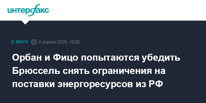 Москва. 4 апреля. INTERFAX.RU - Премьер-министры Венгрии и Словакии Виктор Орбан и Роберт Фицо в телефонной беседе договорились о совместных действиях в попытке убедить руководство ЕС снять ограничения на поставки нефти и газа из России.