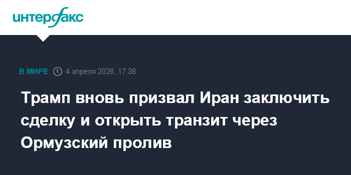Москва. 4 апреля. INTERFAX.RU - Президент США Дональд Трамп вновь выступил с угрозами в адрес Ирана, призвав его заключить сделку и разблокировать транзит через Ормузский пролив.