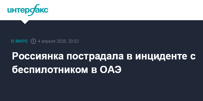 Москва. 4 апреля. INTERFAX.RU - Проживающая в ОАЭ россиянка пострадала при падении обломков нейтрализованного БПЛА в эмирате Абу-Даби, ей оказана необходимая помощь, сообщает посольство России в ОАЭ в субботу.