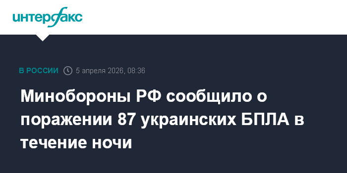 Москва. 5 апреля. INTERFAX.RU - Российские военные сообщили, что с 22:00 субботы до 08:00 мск воскресенья над 14 российскими регионами были перехвачены и уничтожены 87 украинских беспилотных летательных аппаратов самолетного типа.