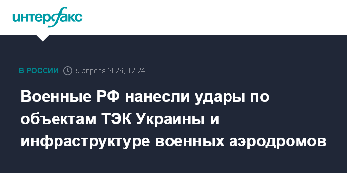 Москва. 5 апреля. INTERFAX.RU - Российские военные заявили, что в течение суток нанесли удары по объектам топливно-энергетического комплекса, используемым в интересах ВСУ, а также военным аэродромам.
