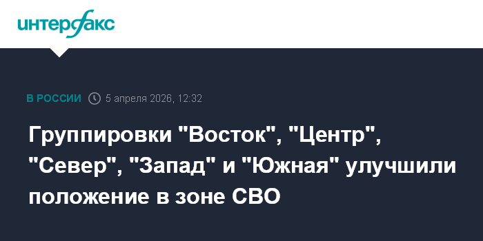 Москва. 5 апреля. INTERFAX.RU - Группировки войск "Восток", " Центр", "Север", "Запад" и "Южная" в течение суток улучшили положение в зоне спецоперации, группировка "Восток" продвинулась в глубину украинской обороны, сообщили в Минобороны РФ в воскресенье.