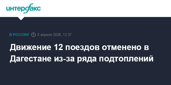 Москва. 5 апреля. INTERFAX.RU - Движение двенадцати пригородных поездов отменено в Дагестане из-за последствий непогоды, сообщает пресс-служба Северо-Кавказской железной дороги (СКЖД) в воскресенье.