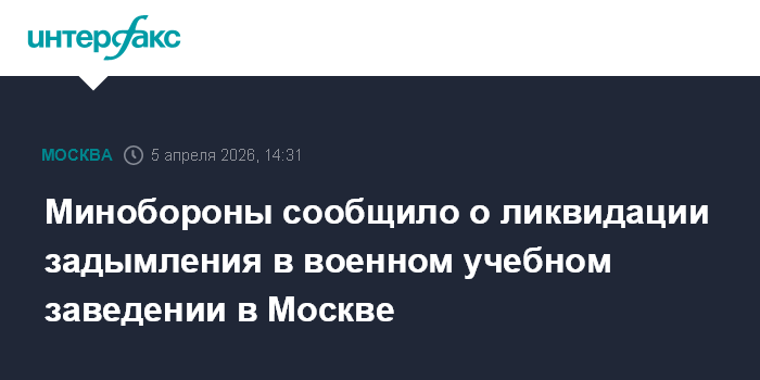 Москва. 5 апреля. INTERFAX.RU - Минобороны РФ сообщило, что задымление на территории одного из военных учебных заведений в столице ликвидировано.