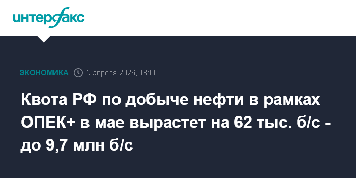 Москва. 5 апреля. INTERFAX.RU - Разрешенный уровень добычи нефти для России в рамках ОПЕК+ в мае вырастет на 62 тыс. б/с, до 9,699 млн б/с, говорится в пресс-релизе ОПЕК по итогам заседания "группы восьми".