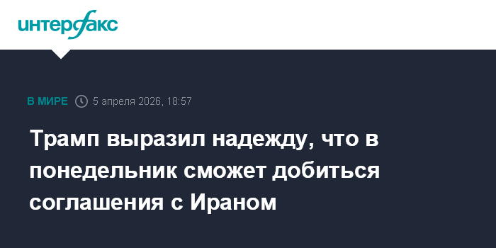 Москва. 5 апреля. INTERFAX.RU - Президент США Дональд Трамп надеется, что за понедельник сможет добиться соглашения по урегулированию кризиса с Ираном.
