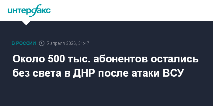 Москва. 5 апреля. INTERFAX.RU - Полмиллиона жителей Донецкой Народной Республики остались без света в результате украинской атаки, сообщил председатель правительства региона Андрей Чертков.