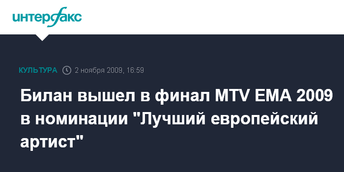Москва. 2 ноября. INTERFAX.RU – Российский поп-исполнитель Дима Билан вошел в пятерку финалистов номинации "Лучший европейский артист" MTV EMA 2009, сообщила пресс-служба телеканала МТV в понедельник.