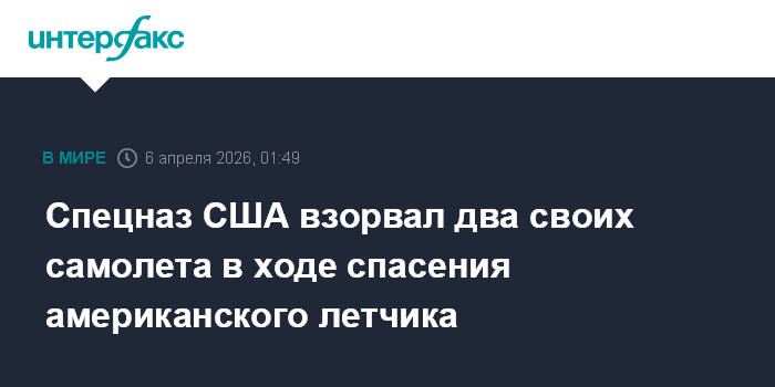 Москва. 6 апреля. INTERFAX.RU - Американский спецназ был вынужден взорвать два своих транспортных самолета C-130 в ходе проведения операции по спасению летчика сбитого Ираном истребителя F-15E ВВС США, сообщил телеканал ABC News со ссылкой на информированный источник.