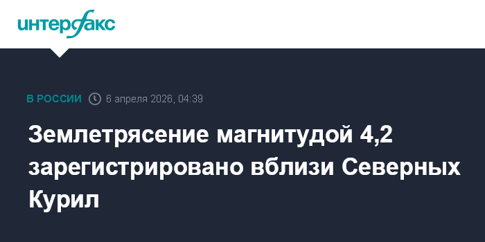 Москва. 6 апреля. INTERFAX.RU - Землетрясение магнитудой 4,2 произошло утром в понедельник возле Северных Курил Сахалинской области, сообщили "Интерфаксу" в Сахалинском филиале Единой Геофизической службы РАН.