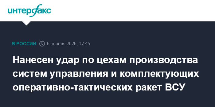 Москва. 6 апреля. INTERFAX.RU - Российские военные за минувшие сутки поразили объекты производства систем управления и комплектующих украинских оперативно-тактических ракет, энергетическую инфраструктуру ВСУ, сообщило Минобороны РФ в понедельник.