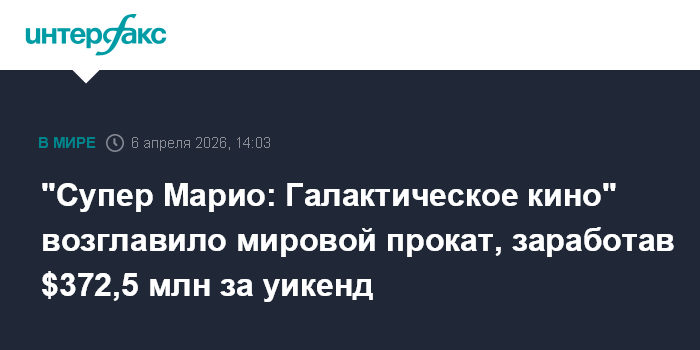 Москва. 6 апреля. INTERFAX.RU - Анимационный фильм "Супер Марио: Галактическое кино" стал лидером североамериканского и общемирового проката в прошлые выходные, пишет The Wall Street Journal.