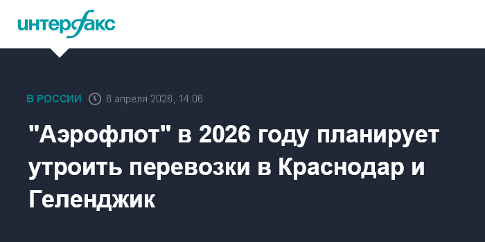 Москва. 6 апреля. INTERFAX.RU - Группа "Аэрофлот" в 2026 году рассчитывает в 3 раза увеличить пассажиропоток в аэропорты Краснодара и Геленджика, сообщил глава компании Сергей Александровский на встрече с президентом Владимиром Путиным.