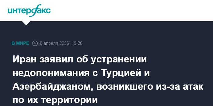 Москва. 6 апреля. INTERFAX.RU - Власти Ирана устранили недопонимание, возникшее с Турцией и Азербайджаном после сообщений о запусках ракет и беспилотников в сторону этих стран с территории Ирана, заявил в понедельник представитель МИД страны Эсмаил Багаи.