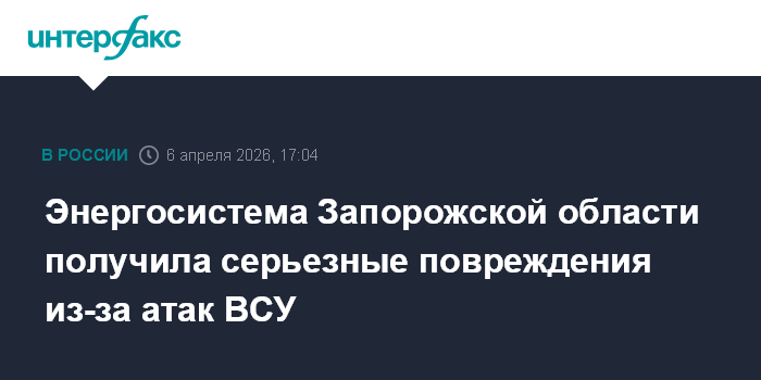 Москва. 6 апреля. INTERFAX.RU - Энергосистема Запорожской области получила серьезные повреждения в результате украинских атак, прогнозируются отключения света, сообщил губернатор региона Евгений Балицкий в понедельник.