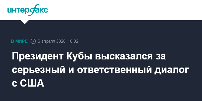 Москва. 6 апреля. INTERFAX.RU - Президент Кубы Мигель Диас-Канель на встрече с представителями Конгресса США высказался за проведение диалога с Вашингтоном. Он сообщил об этом в соцсети Х.