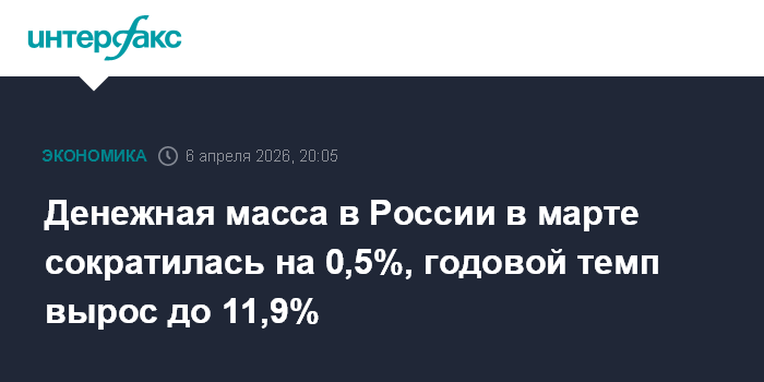 Москва. 6 апреля. INTERFAX.RU - Денежная масса (агрегат М2) в России в марте 2026 года, по предварительной оценке, сократилась на 0,5%, до 130,4 трлн рублей, после увеличения в феврале на 2,5%, сообщает сайт Банка России.