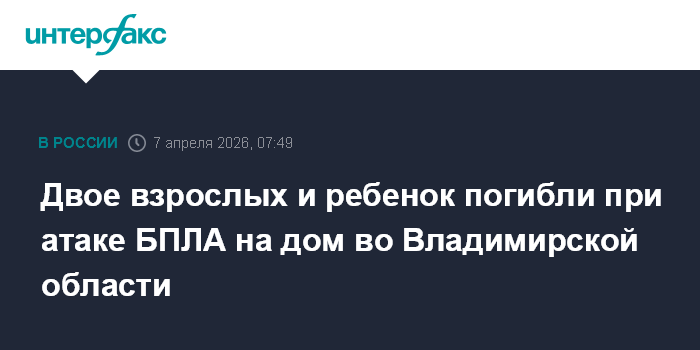 Москва. 7 апреля. INTERFAX.RU - Три человека, включая ребенка, погибли при атаке беспилотника на жилой дом в Александровском районе Владимирской области, сообщил губернатор Александр Авдеев.