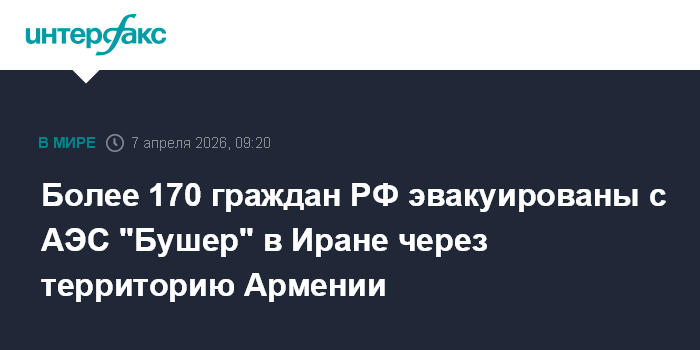 "6 апреля еще 175 граждан России, прибывшие из Ирана в Армению через пограничный переход (КПП) "Нурдуз"/"Агарак" в составе очередной группы эвакуированных сотрудников АЭС "Бушер", вылетели спецрейсом из Еревана в Москву", - заявила пресс-служба посольства России в Ереване.