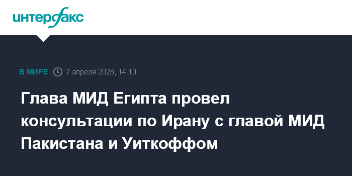 Москва. 7 апреля. INTERFAX.RU - Министр иностранных дел Египта Бадр Абдельати провел телефонные переговоры с главой МИД Пакистана Исхаком Даром и со спецпосланником президента США Стивом Уиткоффом, они обсуждали иранский кризис, сообщает EFE со ссылкой на МИД Египта.