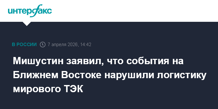 Москва. 7 апреля. INTERFAX.RU - Конфликт на Ближнем Востоке привел к нарушению работы традиционных морских маршрутов, обеспечивающих логистику поставок нефти и газа; их восстановление потребует значительных инвестиций и времени, считает премьер-министр РФ Михаил Мишустин.