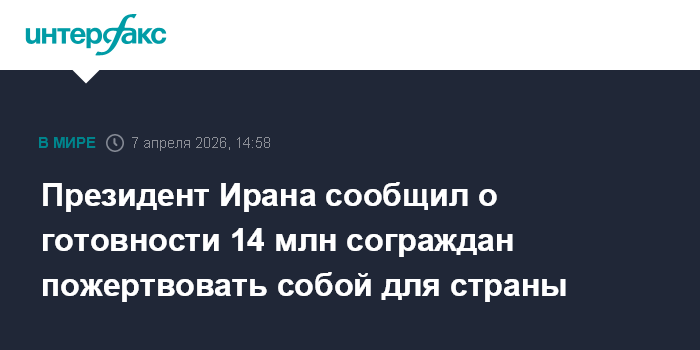 Москва. 7 апреля. INTERFAX.RU - Более 14 млн граждан Ирана присоединились к так называемой кампании "Джанфада", участники которой выражают готовность защищать свою страну, если потребуется - ценой собственной жизни, написал в соцсети Х президент Ирана Масуд Пезешкиан.