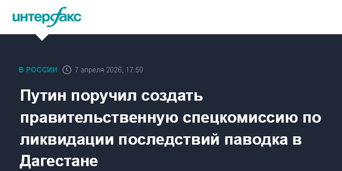 Москва. 7 апреля. INTERFAX.RU - Президент РФ Владимир Путин распорядился создать правительственную спецкомиссию по ликвидации последствий паводка в Дагестане.